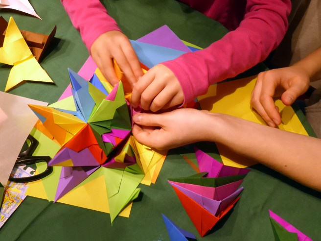 BesucherInnen können Origami-Baumschmuck herstellen, Weihnachtskarten entwerfen (und schreiben :-)), Kalender gestalten, Drucken mit der Druckpresse u.v.m.